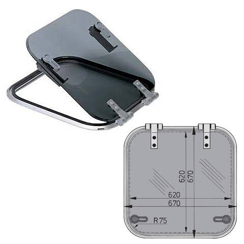Vetus hatch. Tip Planus. Anodize alüminyum çerçevesi 75 mm köşe açılıdır. Camı 10 mm duman rengi akriliktir.
