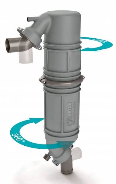 | Vetus Muffler/Goose Neck, Tip NLPG. Muffler ve goose neck fonksiyonlarını birleştirirken iyi bir egzoz sisteminin özelliklerini kaybettirmeden hem kurulum zamanından tasarruf sağlar hem de alandan tasarruf sağlar. Goose neck suyun geri dönüşünü engellerken, muffler da egzoz hattındaki suyu daha fazla karıştırarak, egzoz sesini düşürmeye çalışır. Sonuçlar etkileyici olup, dönüş basıncı neredeyse yok sayılabilir. Bu yeni modelin hem parçaları hem de hortum bağlantıları kolay kurulum sağlayabilmek için tamamen dönebilir özelliktedir. Maksimum sürekli çalışma sıcaklığı 70 °C’dir. Soğutma suyu hattının püskürtme noktasının “C” su kesimi hattından yüksekliği 15 cm veya daha fazla yukarıda olmalıdır. |
