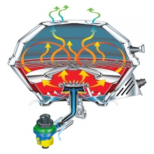 18-9 paslanmaz çelik radyan ısıtıcısı ile fırın, ocak veya mangal olarak kullanıma imkan sağlar. Ocak olarak kullanıldığında direkt alev verebilirken, mangal pozisyonunda mükemmel ısı dağılımı sağlar. Menteşeli kapağı rüzgar etkisini ortadan kaldırmaya yardımcıdır. Piezo çakmaklıdır. Mini propan tüp ile çalışmakla beraber, eğer teknede mevcutsa bütan/propan tüpe de adapte edilebilir. Tamamen paslanmaz çeliktir. Montaj kiti ve tüp ayrıca sipariş edilmelidir.
