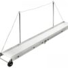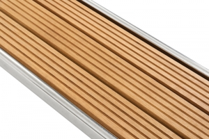 Pasarella, paslanmaz çelik. Ahşap kısımları iroko. Bir çift tekerleği ve montaj parçaları dahil. Ortadan ikiye katlanabilir.