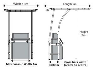 Ø 44 mm anodize alüminyum boru, yüksek dayanımlı reçine takviyeli bağlantılar ve üstün kalitede kaynakla imal edilmiştir. Ayarlanabilir bağlantılarla her tip konsol için uygun. Su geçirmez ve UV dayanımlı Atlas polyester kumaş tente, bakım için sökülebilir.