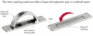 Döner açma sistemi, daha az alanda geniş ve ergonomik bir tutuş sağlar. Gömme montaj. Titreşim önleyici kapatma sistemi ile donatılmıştır.